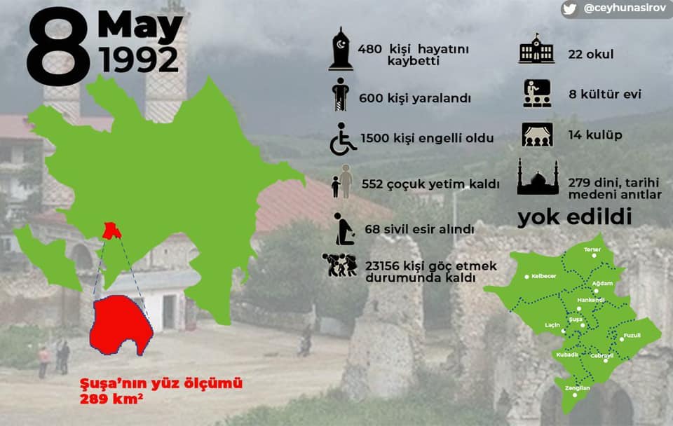 #ŞUŞA Ermenistan işgalinden kurtarılıp özüne, Azerbaycan’ın bağrına geri döndü. Paylaşım Tarihi - Aralık 22, 2020 Ali Dursun ER 28 yıl sonra #ŞUŞA Ermenistan işgalinden kurtarılıp özüne, Azerbaycan’ın bağrına geri döndü. Azerbaycan daim Muzaffer olsun. Şehitlerimize rahmet olsun. İki devlet TEK MİLLET. Şuşa’nın Ermenistan işgali esnasındaki verilerdir.
